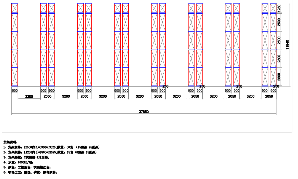 1、貨架規(guī)格:L2500*D900*H3525 數量:60套 (15主45副)