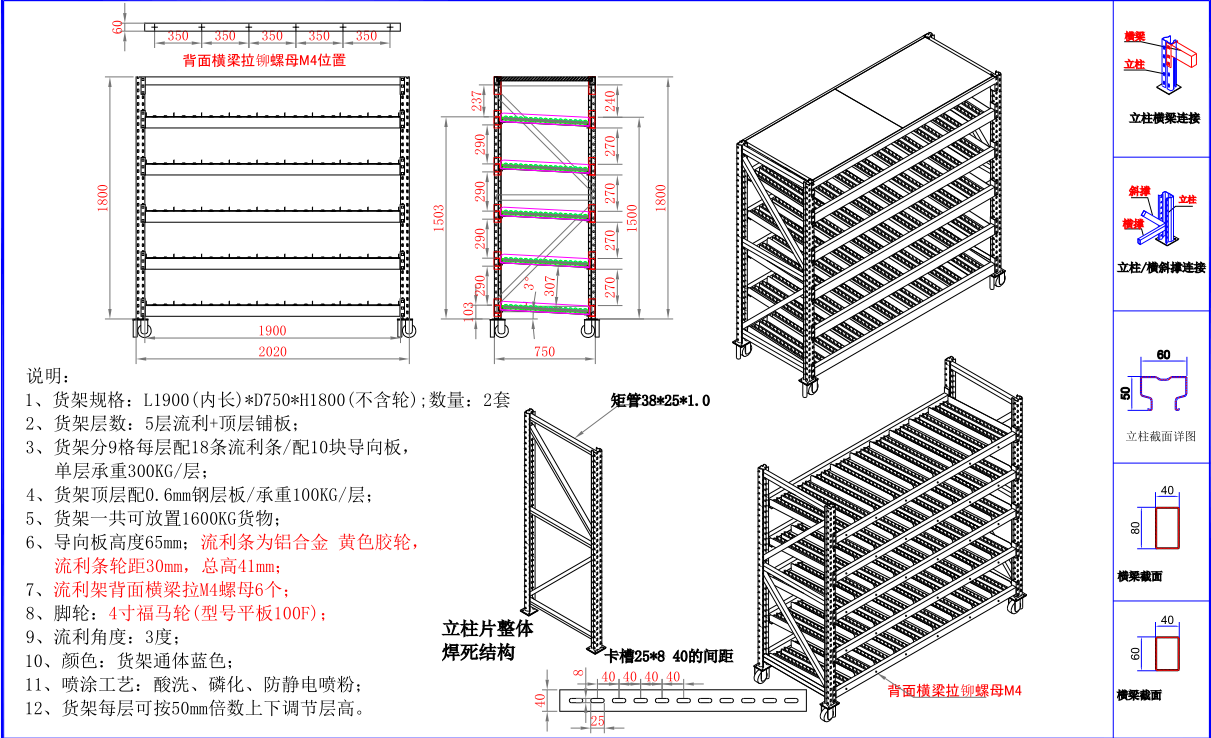 上圖是根據(jù)客戶要求貨架規(guī)格L1900*W750*H1800 不含腳輪 數(shù)量 5套 貨架層數(shù):5層流利+頂層鋪板 貨架每層配18條流利條,配10塊導向板 單層承重300KG/層貨架頂層配0.6mm鋼層板,承重100KG/層 貨架一共可放置1600KG貨物,導向板高度65mm 流利條為鋁合金,黃色膠輪 流利條輪距30mm 總高41mm 腳輪采用4寸福馬輪 流利條角度為3度 貨架每層可按50mm倍數(shù)上下調(diào)節(jié)層高.