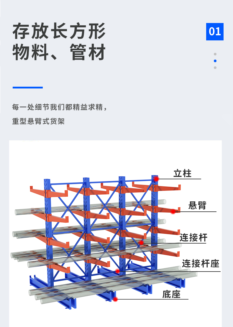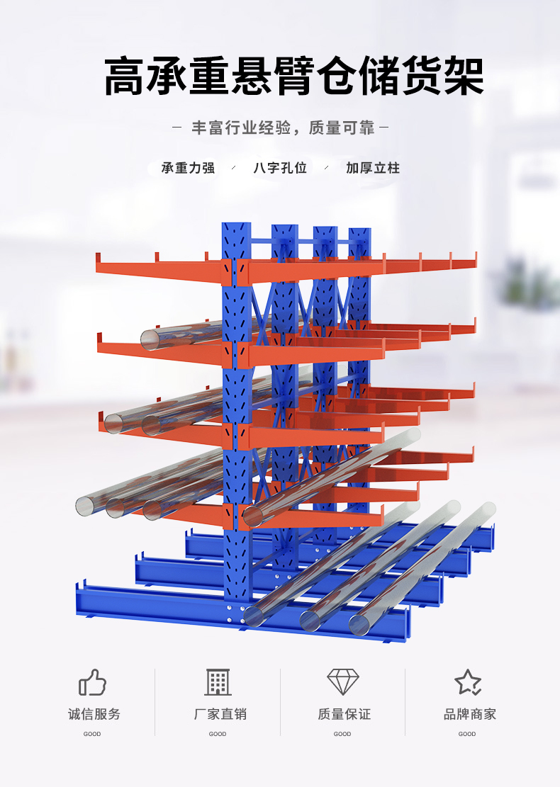 懸臂式貨架有單臂和雙臂之分,專用立柱型材,設(shè)計背拉增強穩(wěn)固型,高強度懸臂,每臂承重可達2T以上,高度依每100mm為單元上下調(diào)節(jié)