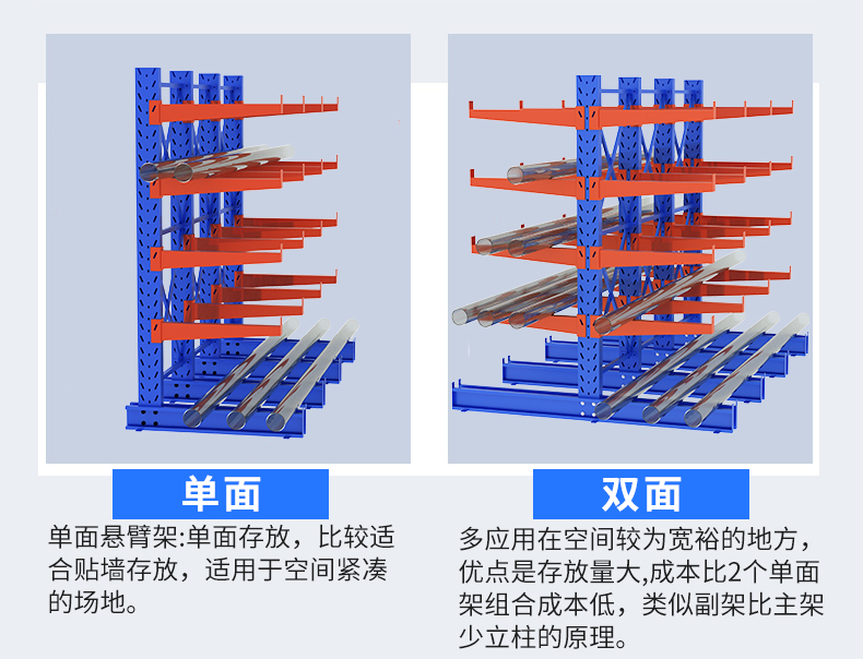 懸臂式貨架是貨架中重要的一種。適用于存放長物料、環(huán)型物料、板材、管材及不規(guī)則貨物??梢允菃蚊婊螂p面,懸臂式貨架具有結(jié)構(gòu)穩(wěn)定,載重能力好、空間利用率高等特點。懸臂式貨架立柱多采用H型鋼或冷軋型鋼,采用方管、冷軋型鋼或H型鋼,懸臂與立柱間采用插接式或螺栓連接式,底座與立柱間采用螺栓連接式,底座采用冷軋型鋼或H型鋼。